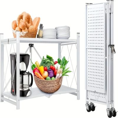رف تخزين قابل للطي بثلاث طبقات مع عجلات، بدون تركيب، أرفف ذات سعة كبيرة، وحدة رفوف معدنية ثقيلة ومتينة، عربة متحركة للجراج، المطبخ، الأرضية، الخزانة (أبيض، 2 طبقة)