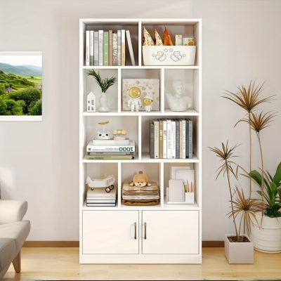 رف كتب طويل عصري مع أبواب وخزائن - خزانة تخزين قوية مستقلة، وحدة رفوف متعددة الطبقات بأقسام مغلقة