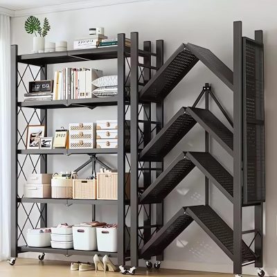 رف تخزين معدني ثقيل 5 طوابق مع عجلات قابلة للتأمين لا يتطلب التجميع، سلة منظم دورانية قابلة للطي مع نظام رفوف من 5 طوابق