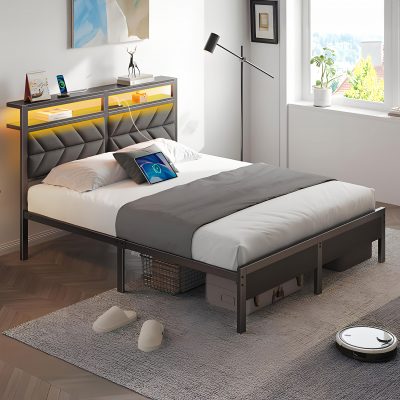 إطار سرير يانارا كينغ (180 سم) أو كوين (160 سم) متين مع محطة شحن (منفذ USB/Type-C/AC)، لوحة LED RGB قابلة للتحكم عبر التطبيق